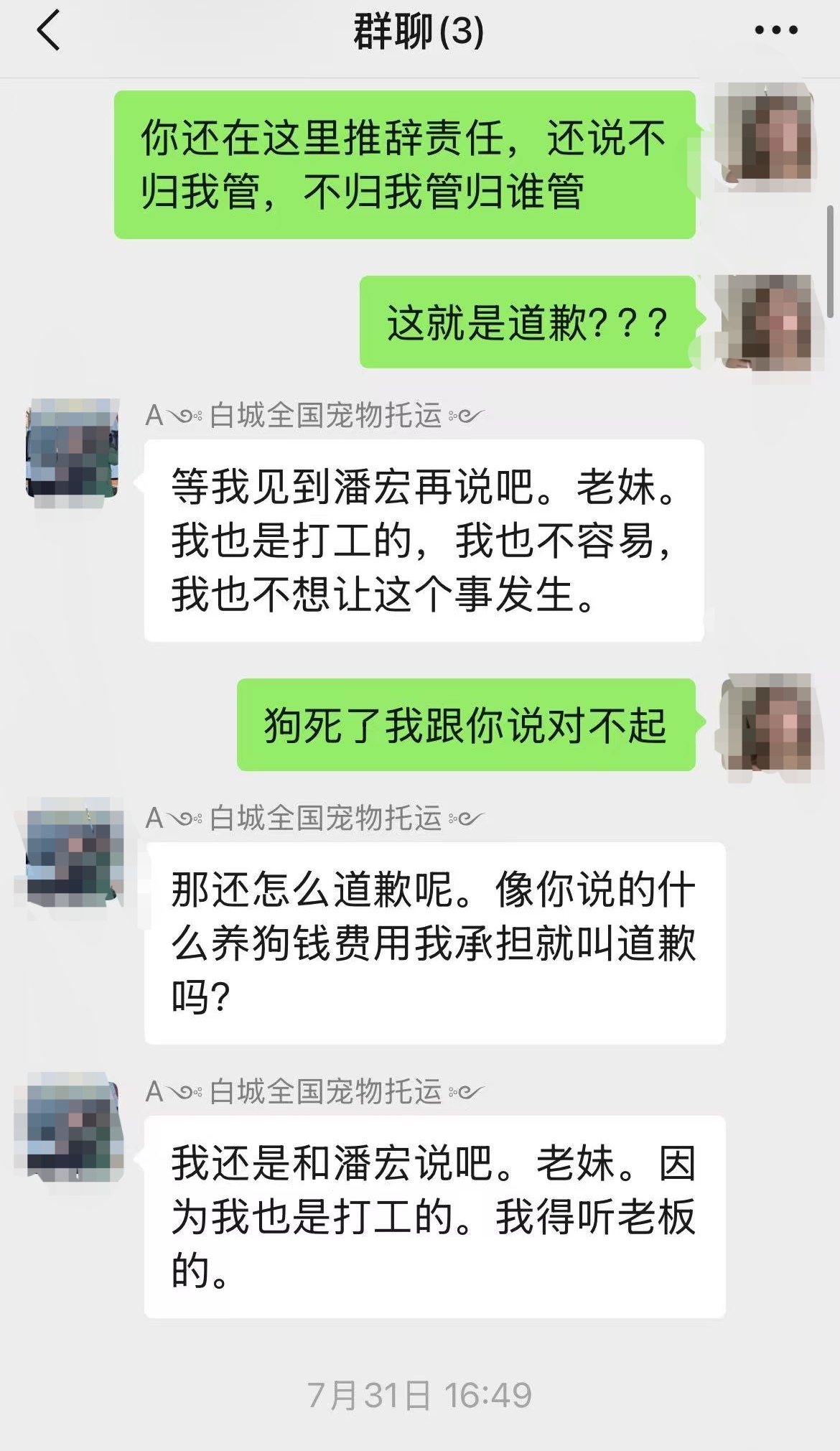 “7月30日,托运公司不停催我签合同,说狗已经到他店里了,不签合同狗进不了园区,他只能再养一天。我当天比较忙,答应第二天去打印合同。”张丽说,7月31日上午9点多,托运公司微信发来一张聊天截图,内容是头天傍晚与其他人的聊天,其中的视频显示“图图”是存活状态。